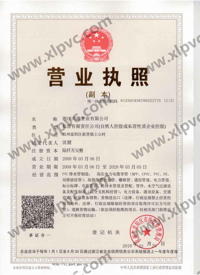 浙江興隆管業(yè)有限公司位于杭州市富陽區(qū)(杭州第九新區(qū)),坐落在新登鎮(zhèn),相距杭州僅60公里,水、陸、空交通運(yùn)輸十分便利。浙江興隆管業(yè)有限公司前身為富陽興隆塑料制品廠,成立于1992年,2008年改名浙江興隆管業(yè)有限公司,數(shù)十年來,公司一直至力于管道的生產(chǎn),目前公司擁有國(guó)內(nèi)先進(jìn)的CPVC保護(hù)管生產(chǎn)線,HPVC()雙壁波紋管生產(chǎn)線,多孔管生產(chǎn)線,玻璃鋼電纜保護(hù)管生產(chǎn)線、MPP電纜保護(hù)管生產(chǎn)線。生產(chǎn)的主要產(chǎn)品有:CPVC電纜保護(hù)管、MPP電力電纜保護(hù)管(頂管)、高強(qiáng)度塑合金管、HDPE給排水管、HPVC()雙壁波紋管、玻璃鋼電纜保護(hù)管、埋地通信用的PVC-U多孔管、PE直壁管、PVC-U雙壁波紋管、梅花管等,年生產(chǎn)能力達(dá)20000萬米。